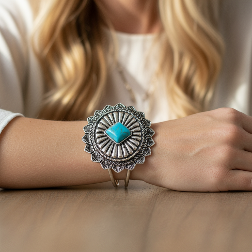 Elevate your style with this Carved Concho Silver Tone Cuff Bracelet, featuring a bold stamped concho accented by a diamond-shaped turquoise color stone at its center. Designed with a convenient hinged clasp, it offers easy wear and removal. Its one-size-fits-most design ensures a comfortable, secure fit, making it a standout accessory for any outfit.