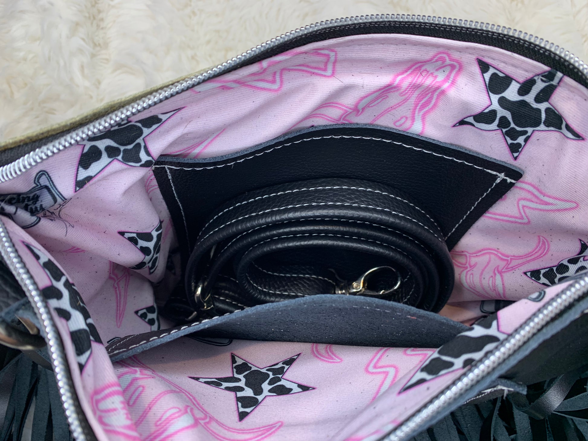 Unleash your inner fashionista with the DCD Patsy handbag! Crafted with royston embossed leather and cowhide, this bag is the epitome of style and sophistication. Make a statement wherever you go and elevate your everyday look with this unique and luxurious handbag. Strap is adjustable.