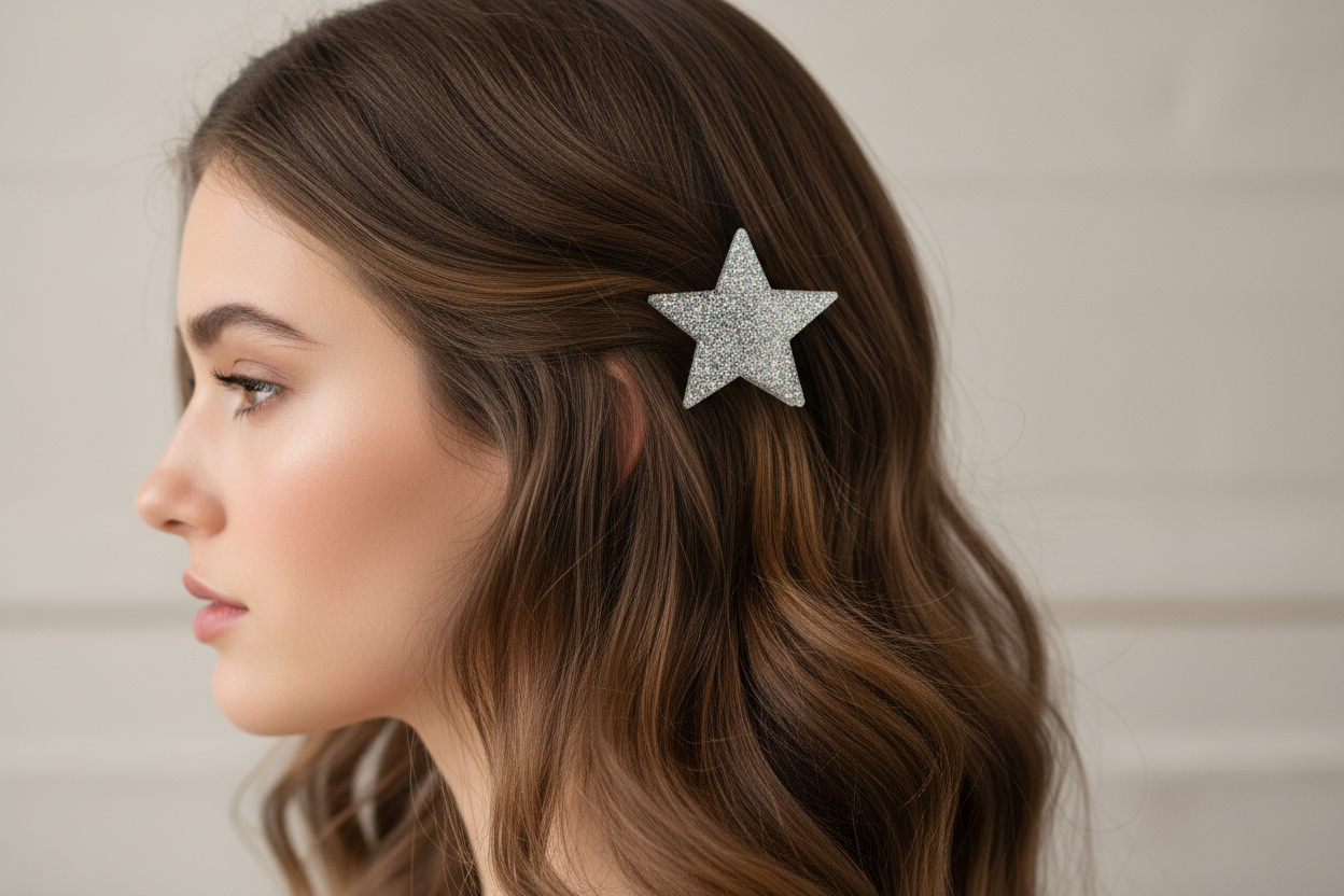 Sparkle and shine with our Glitter Star Hair Clip! Made with a silver glitter clear star, this hair accessory will elevate any hairstyle. Perfect for adding a touch of glamour to your look, this clip is a must-have for every fashionista. Stand out and make a statement with our Glitter Star Hair Clip!