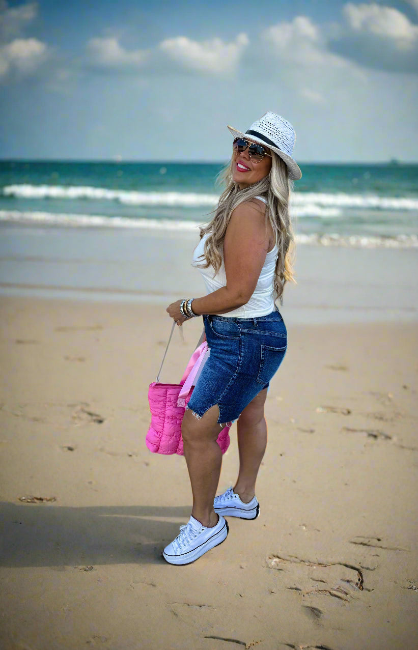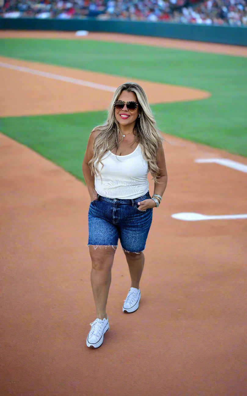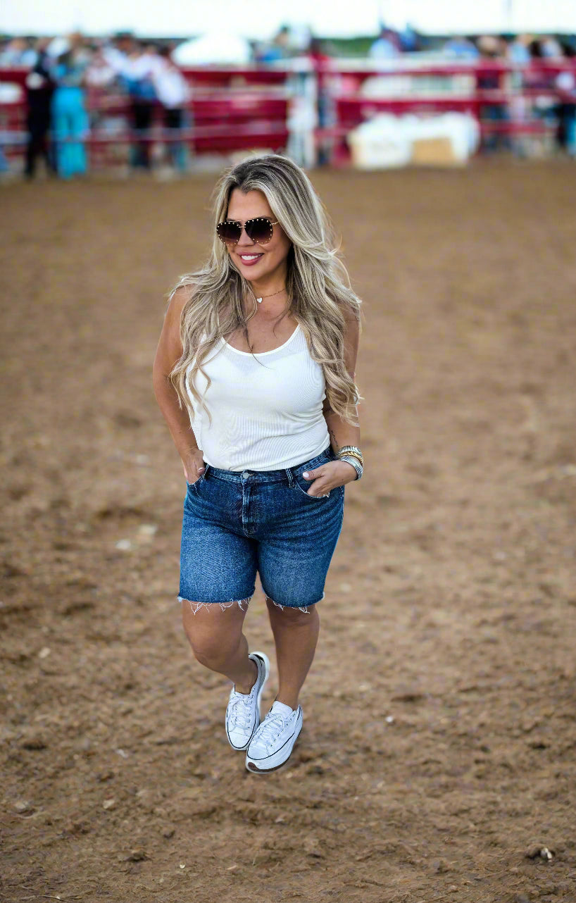 Upgrade your denim collection with our MONROE RAWHEM MID-THIGH SHORTS. These perfect mid thigh shorts are made from a darker denim, giving you a sleek and stylish look. Features a raw hem and with a 3" side slit on the the sides. FIT: Very Stretchy
