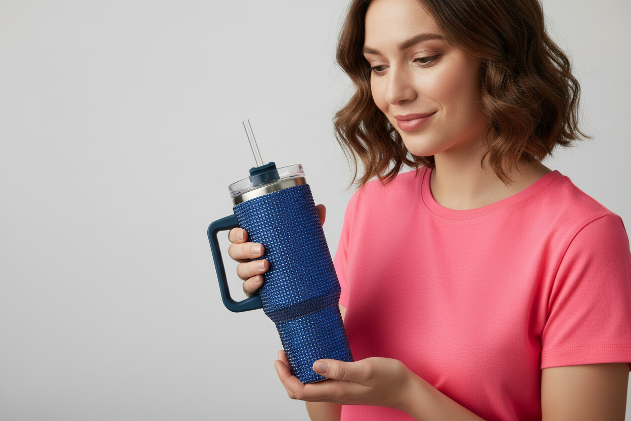 Sparkle through your day with this stunning 40 oz tumbler that's equal parts practical and glamorous. The rich dark blue base gets a serious upgrade with eye-catching rhinestones that catch the light with every sip. Perfect for keeping your favorite beverages at the ideal temperature while turning heads wherever you go. Because hydration should never be boring.