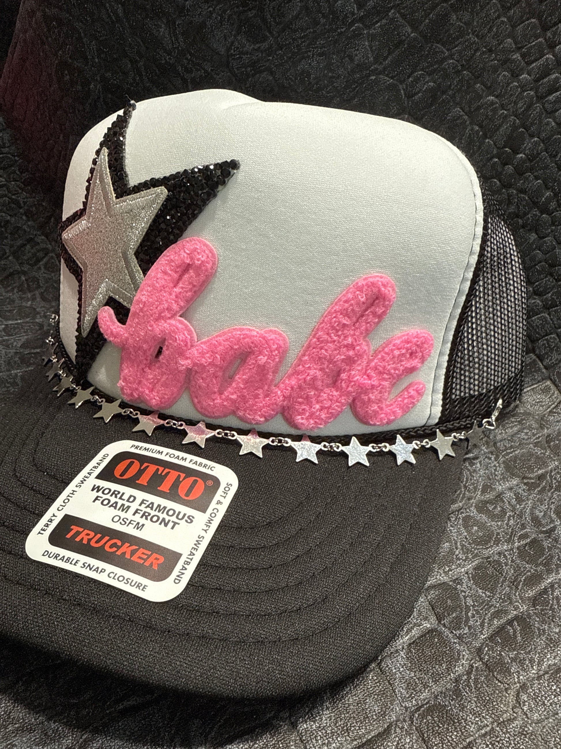 Get ready to shine with our Shine Bright Babe trucker hat! This stylish hat features a silver tone star hat chain and snap back adjustable for the perfect fit. Stand out and make a statement with this must-have accessory.