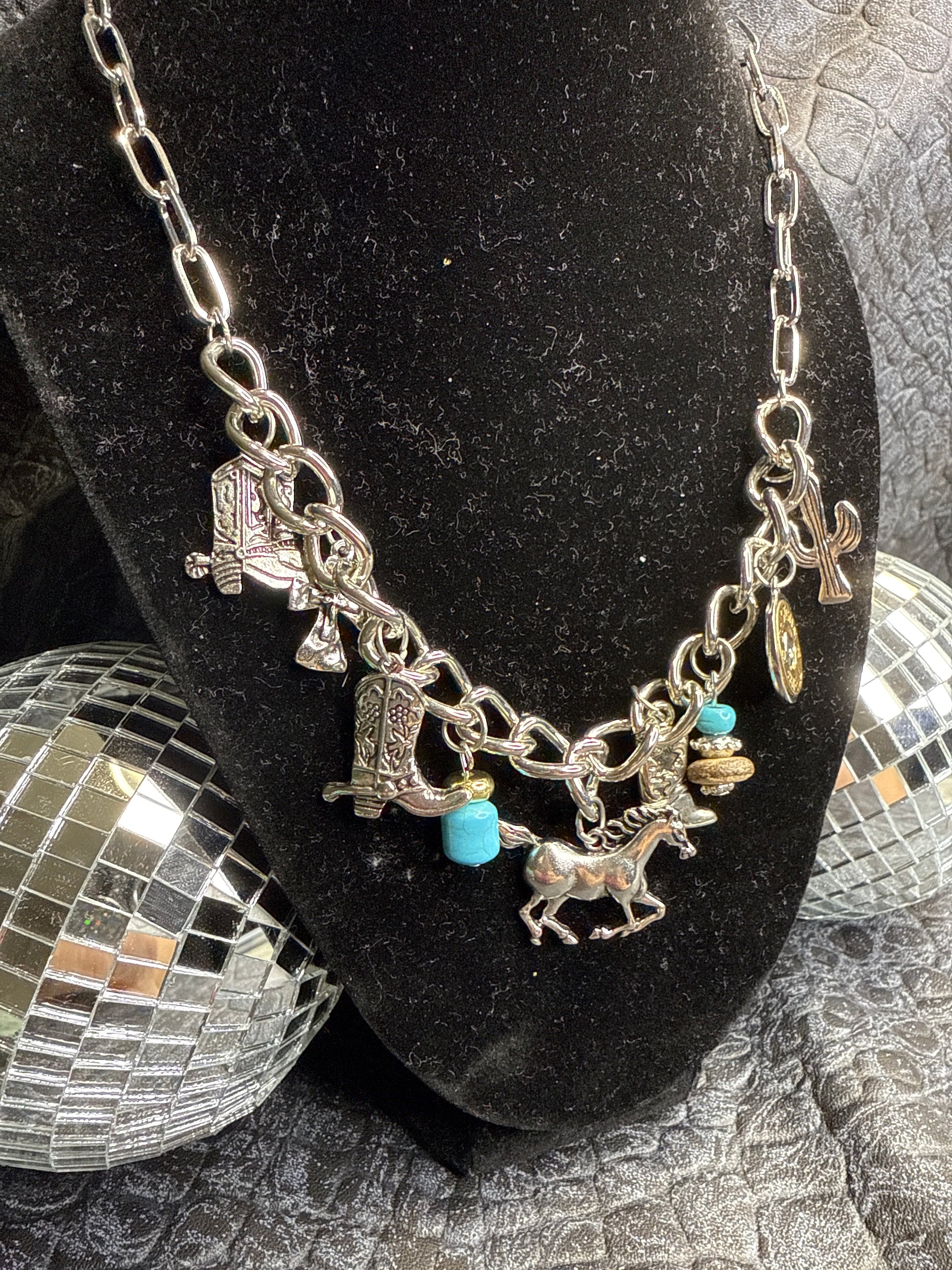 Indulge in the rustic yet elegant design of our Horse Charm Necklace. With a western style charm hanging from a 10-inch adjustable chain, this necklace is not only stylish, but also versatile. Complete with a secure claw clasp, this necklace is perfect for any horse lover. Feel connected to nature with this charming accessory!