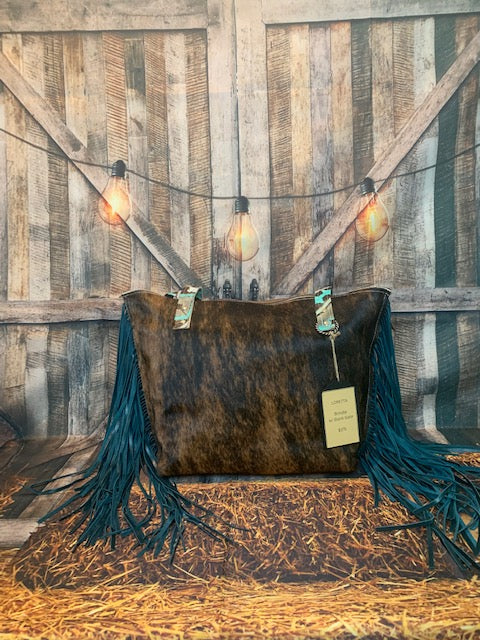 Beautiful Brindle blank slate with Cocoa Navajo tooled handles double sided Aqua fringe. 1 interior & 1 pocket on back approx. 17"x12"x6". Handmade in Oklahoma by DCD.
